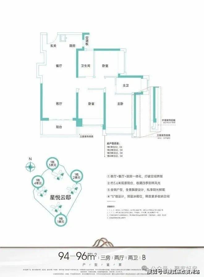94-96㎡三房两厅两卫:经典竖厅格局,客厅3.6米开间,客餐厨一体化设计,三开间朝南,U型厨房。