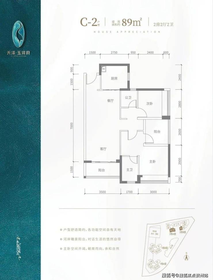 C2户型-89㎡-3房2厅2卫,设计的是竖厅格局,客厅3.5米开间,主卧及客厅阳台都朝南向。