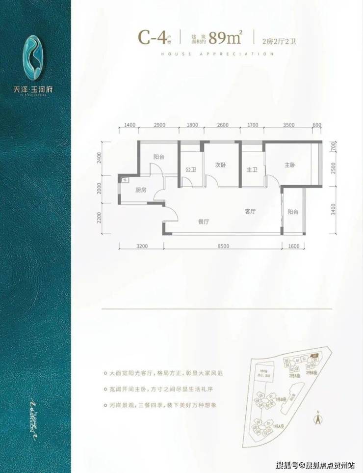 C4户型-89㎡-3房2厅2卫,设计的是竖厅格局,餐客厅一体化,客厅3.4米开间,主卧跟客厅阳台朝东向。