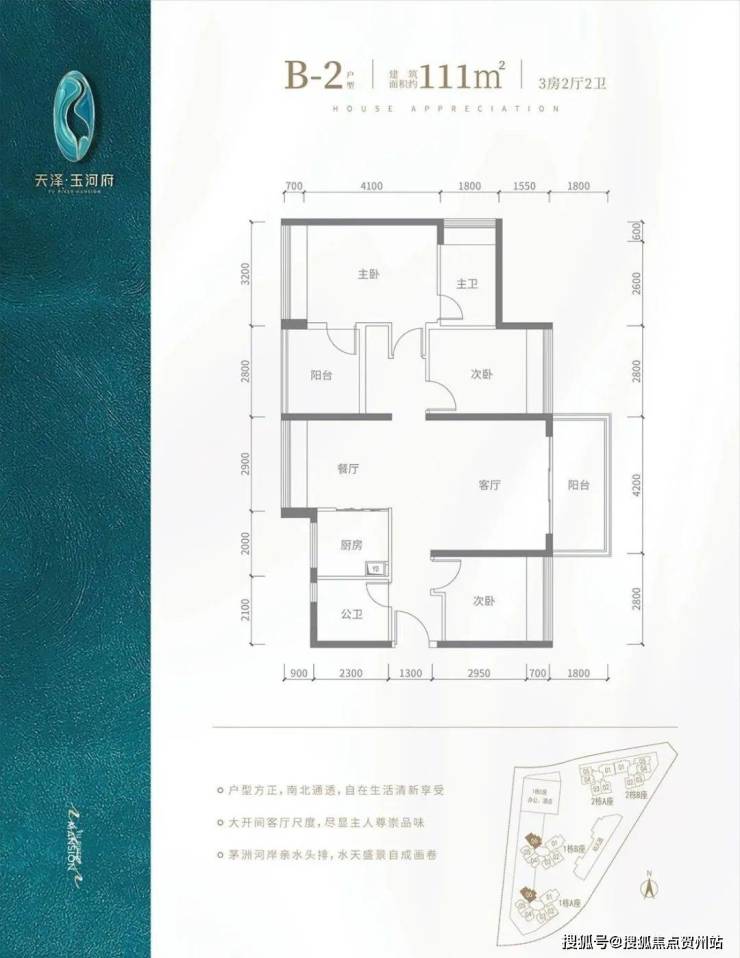 B2户型-111㎡-4房2厅2卫,设计的是竖厅南北通透格局,客厅4.2米开间,阳台主朝东北朝向,看花园景观,全屋飘窗设计。