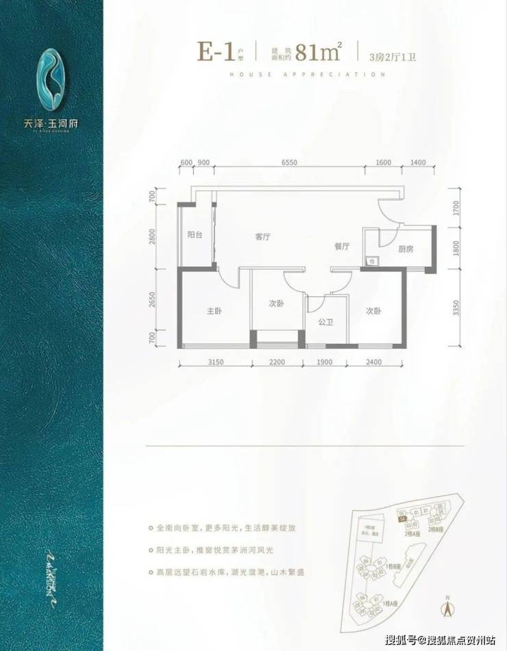 E2户型-80㎡-3房2厅1卫,设计的是竖厅格局,客厅3.5米开间,餐客厅一体化,阳台2.8米长,朝西向。