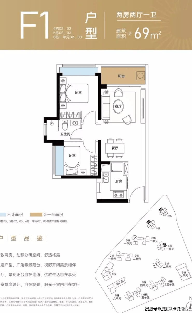 69㎡的2房2厅1卫,设计的是竖厅格局,客餐厅一体化,客厅3.3米开间,L型厨房,得房率:72.94%(不含赠送),西北向看坪山河景观或东北朝向面向锦龙大道。