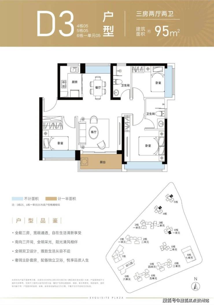 95㎡的3房2厅2卫(D3),设计的是竖厅双龙抱珠格局,客厅3.7米开间,三开间朝南,L型厨房,得房率:72.95%(不含赠送),阳台主朝东南或西南朝向。