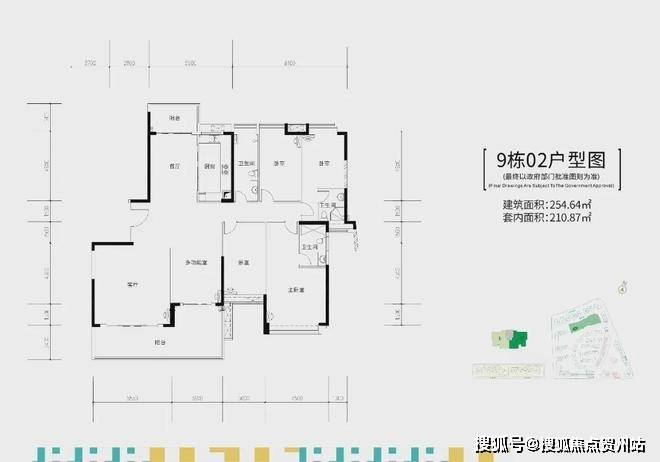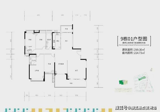 9栋,两梯两户,建面约255-259㎡五房大平层户型。