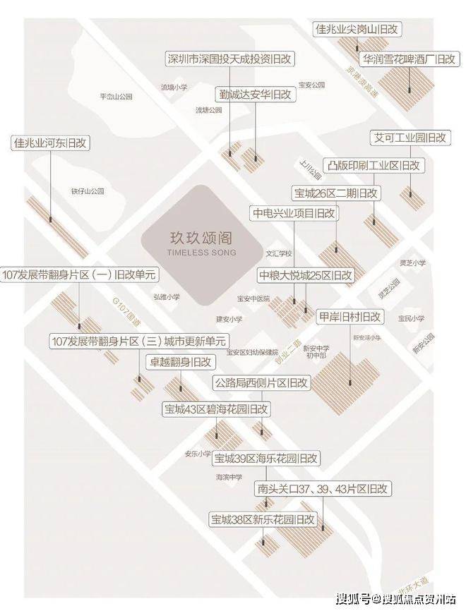 新安片区,尤其是在沿前进路正在进行着大规模的城市更新,分布着共20个旧改项目,超千万的旧改体量,相当于新安整个片区重建。仅我们项目2公里范围内就汇聚了8个旧改项目,分别是沃尔玛购物广场片区旧改、安华工业东区旧改,卓越翻身旧改、宝城碧海花园旧改、公路局西侧旧改、甲岸村旧改、宏发新领域、中洲中央公园二期。