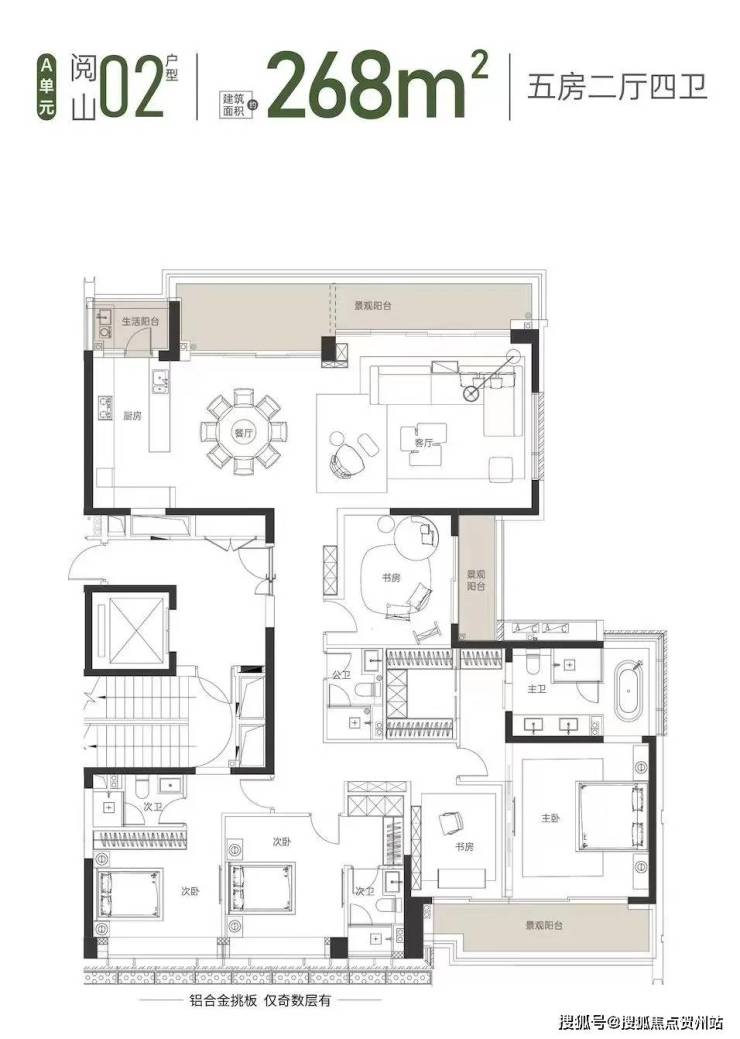 建面约268㎡的大平层户型,为五房四卫三套间设计,动静分区,将生活与居住空间相对分隔。