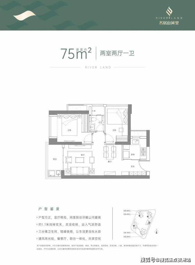 75㎡的2房2厅1卫,设计的是竖厅格局,客厅3.3米开间,LDKB一体化,2个卧室分别做到了主卧9.6㎡/次卧8.88㎡(套内面积,包含墙体),L型厨房,卫生间干湿分离,得房率:71.46%(不含赠送),阳台1.6米进深,西南朝向。