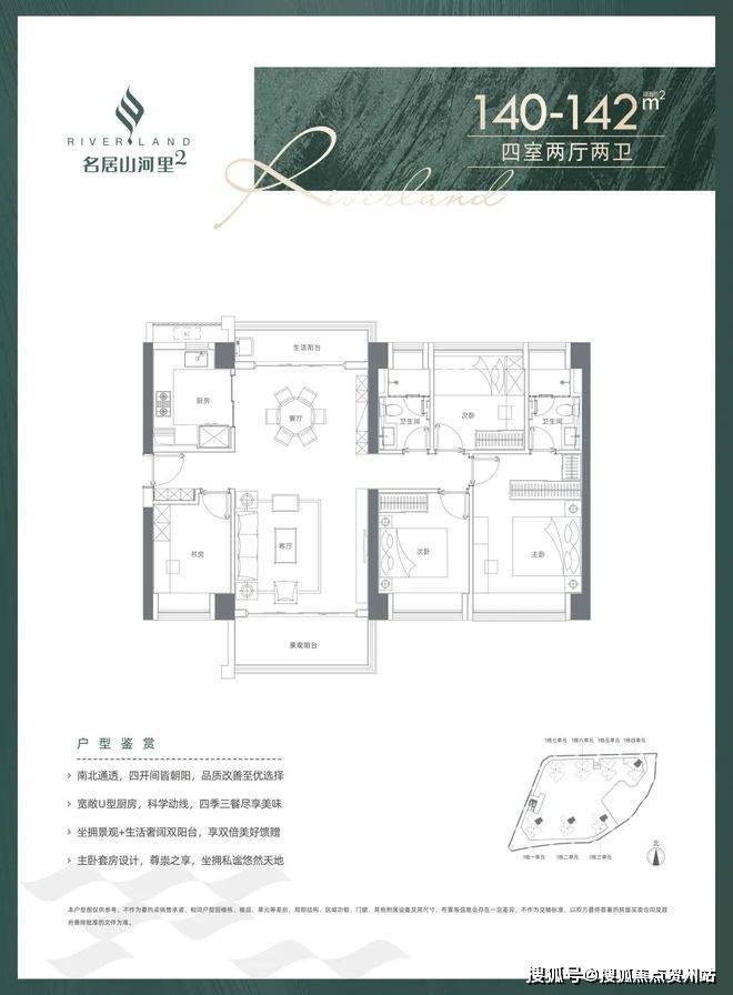 141㎡的4房2厅2卫,设计的是竖厅格局,客厅4.3米开间,南北通透双阳台,四开间朝南,全屋飘窗,U型厨房,得房率:74.83%(不含赠送),阳台1.5米进深,主朝东南向。