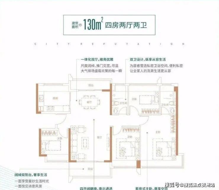 130㎡的4房2厅2卫,设计的是竖厅南北通透格局,客厅4.1米开间,一体化双厅双阳台,四开间朝南,主卧270°转角飘窗大套间设计,U型厨房,卫生间干湿分离,得房率:78.43%(不含赠送),阳台主朝东南向。