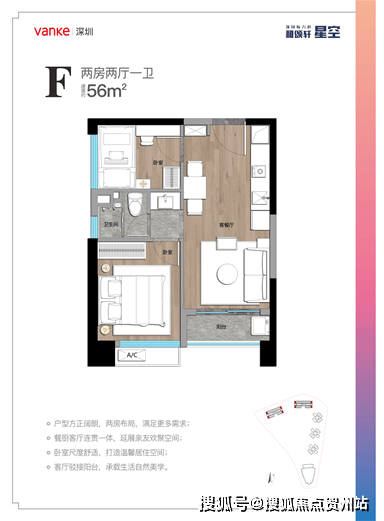 ③约56㎡产品:两房布局,全明空间,户型方正实用,餐厨客厅连贯一体,客厅接驳阳台;