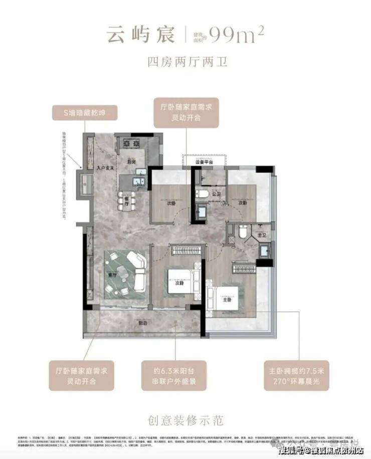99㎡的4房2厅2卫,设计的是竖厅格局,客厅3.35米开间,LDKB一体化,S墙设计预留双开门冰箱卡槽位,三开间朝南,动静分区,U型厨房,公卫三段式干湿分离,赠送设备平台,得房率约78.27%(不含赠送),客厅连接次卧出9.37m²大阳台西南或东南朝向。靓点:99平做到了4房2卫,主卧270°无柱转角飘窗,厨房烟道外置+额外赠送设备平台,并且是纯南向格局。