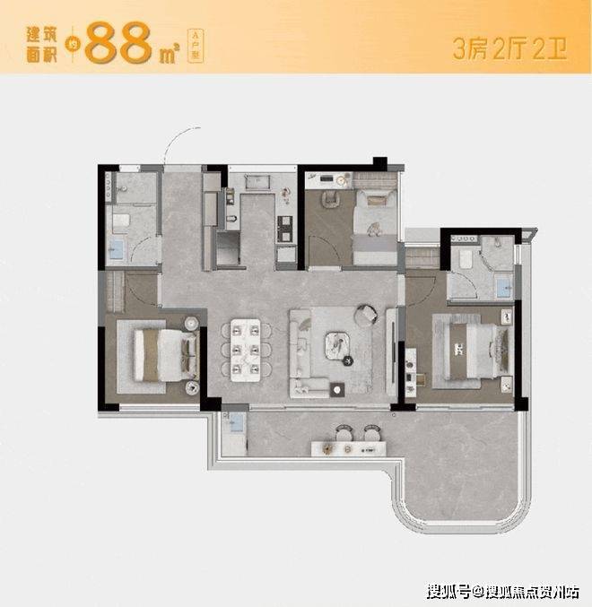 建面约88㎡的小户型,能做到三房两卫+主卧套间的配置,客厅开间5.6米的尺度,全赠送的超大空中露台,整体空间拉满。