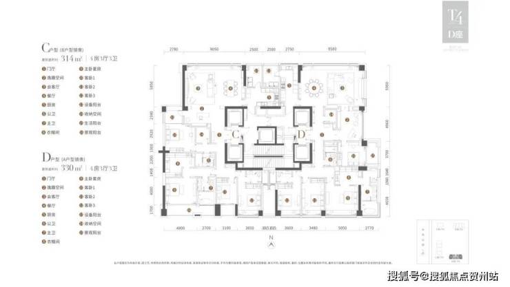 B/C户型:330m²四房三厅四卫,南北通透(卧室全南向)