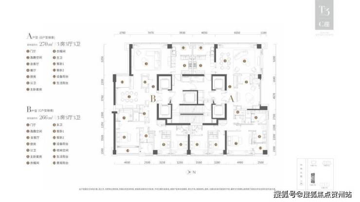 12-20F偶数层户型:533平,五房五厅六卫,南北通透