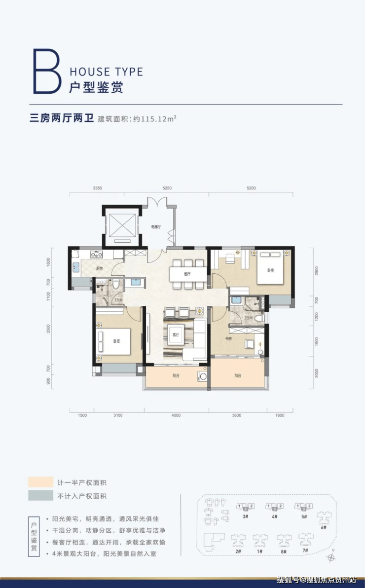 5栋分布两个户型,面积分别为115㎡、143㎡,均为南向。