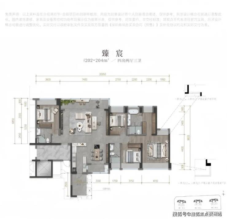 【产品户型】:建面约202-204m四房两厅三卫、