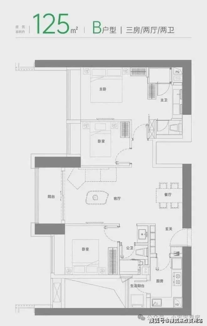 B户型建面约125㎡三房两厅两卫