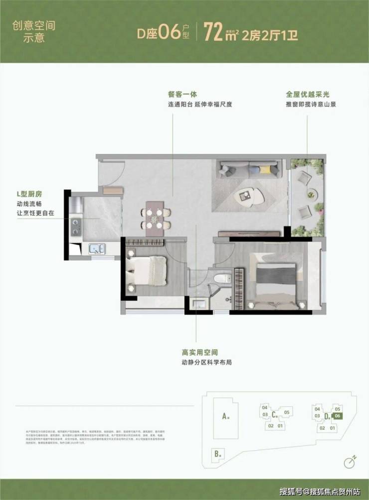 72㎡的2房2厅1卫,设计的是竖厅格局,客厅3.5米开间,LDKB一体化设计,2个卧室分别做到了主卧12.93㎡/次卧9.99㎡(包含墙体飘窗),L型厨房,卫生间干湿分离,得房率约80%(不含赠送),东北朝向。