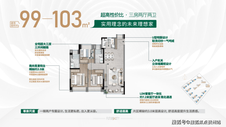 约100平方米的全通透户型,以三开间朝南设计,提供更多的采光空间和新鲜空气,使家庭功能空间布局更加通透自然,每一天都洋溢着阳光和幸福。
