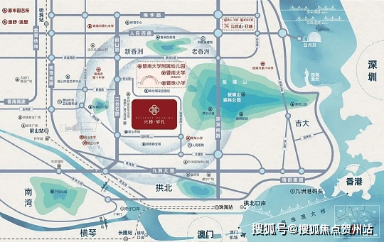基本信息:位于珠海市香洲区三溪科创城核心区域,球场街与新外街交叉口西北侧。占地约 4.5 万㎡,总建筑面积约 7 万㎡,容积率 3.1,绿化率 35%,总户数 376 户,停车位 483 个,车位配比为 1:1.3。项目规划有 4 栋高层,主打 91-173㎡精装三至五房,还配套有 8600㎡邻里中心与社区公园。