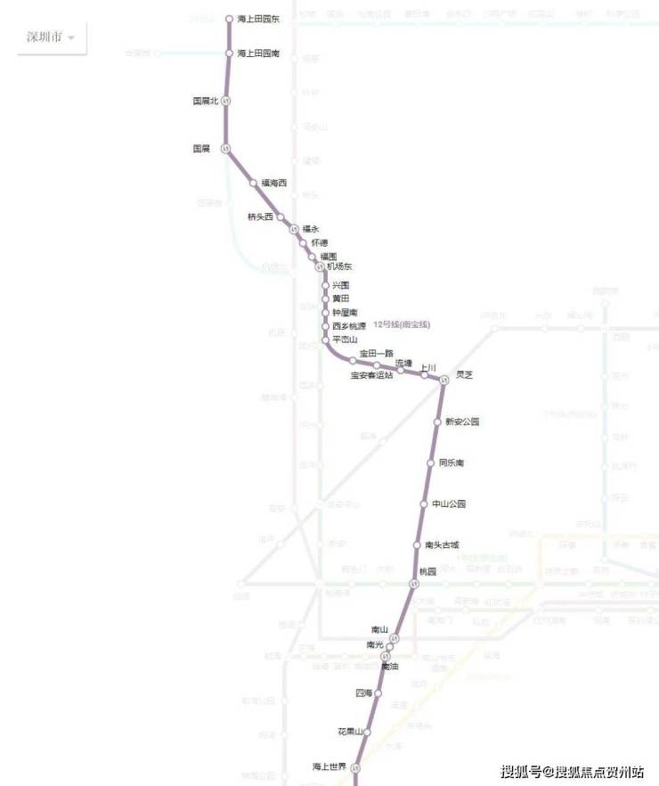 地铁12号线由南向北依次串联蛇口自贸区、南山中心区、前海自贸区、宝安中心区、机场和会展片区,是支撑深圳西部发展轴的轨道交通骨干线。