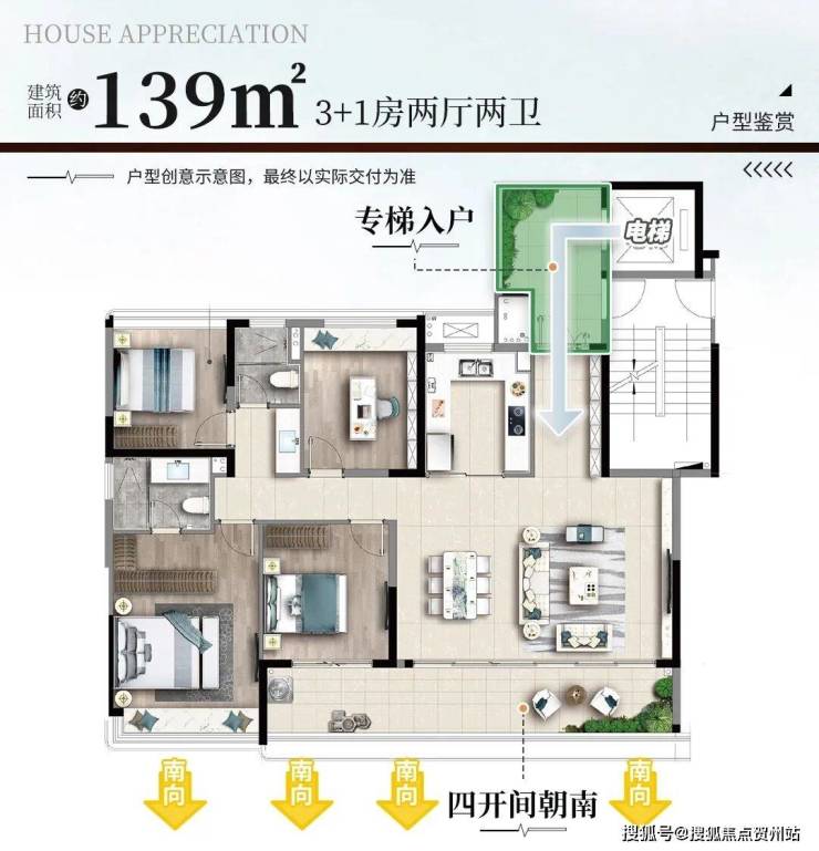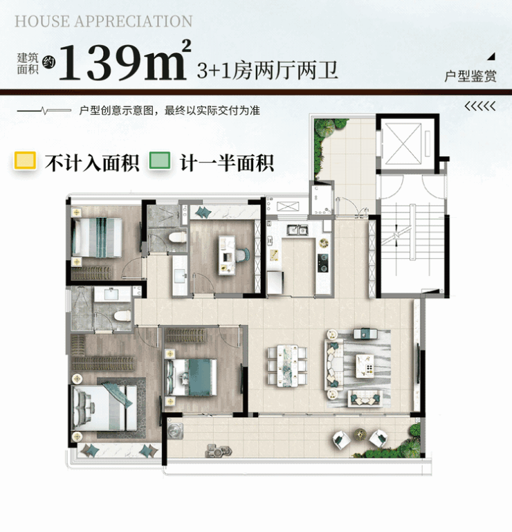 全屋所有飘窗、专属入户皆不计面积;约10.2米开间巨幕大阳台只计一半面积,一个次卧,同样只计一半,实际使用率非常高。