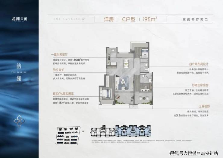 龙湖天澜约96㎡臻稀奢境洋房,创新四叶草布局,保证了全家人起居的私密性,以全屋超100%高使用率,重新定义空间的奢享。