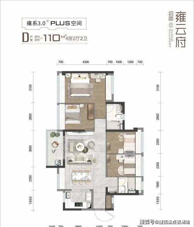 110㎡的4房2厅2卫,设计的是横厅南北通透格局,客餐厅一体化6米开间,4个卧室分别是3.1/2.8/2.3/2.3米的宽度,L型厨房,公卫三段式分离设计,得房率:78.7%(不含赠送),阳台主朝西南向。