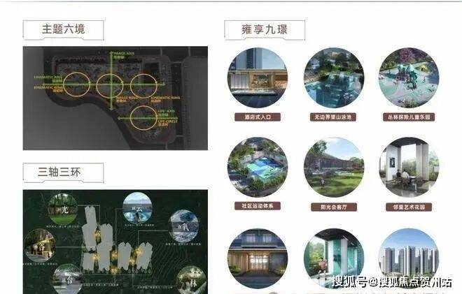 景观园林以“借山还山,师法自然”为设计理念,以“三轴三环”为结构,以”六境九璟“为核心景观主题,打造约2万㎡全龄乐活生态公园。