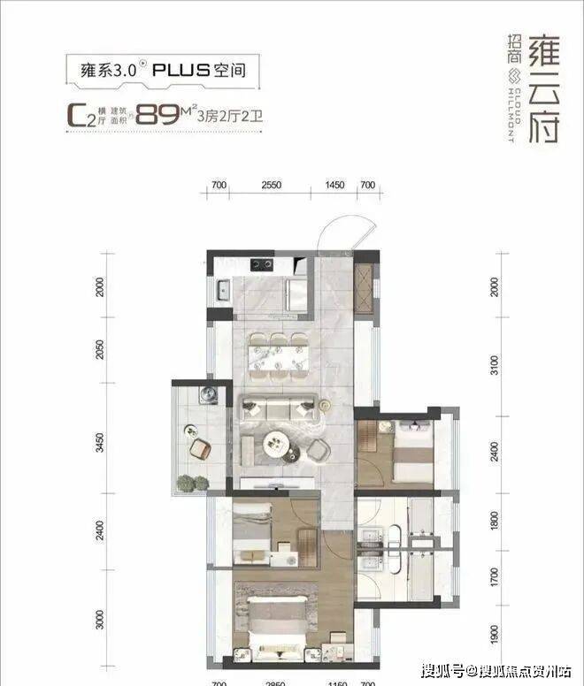 89㎡的3房2厅2卫(C2户型) ,设计的是横厅南北通透格局,客餐厅一体化5.5米开间,3个卧室分别是3/2.4/2.4米的宽度,L型厨房,阳台主朝西南或东南向。