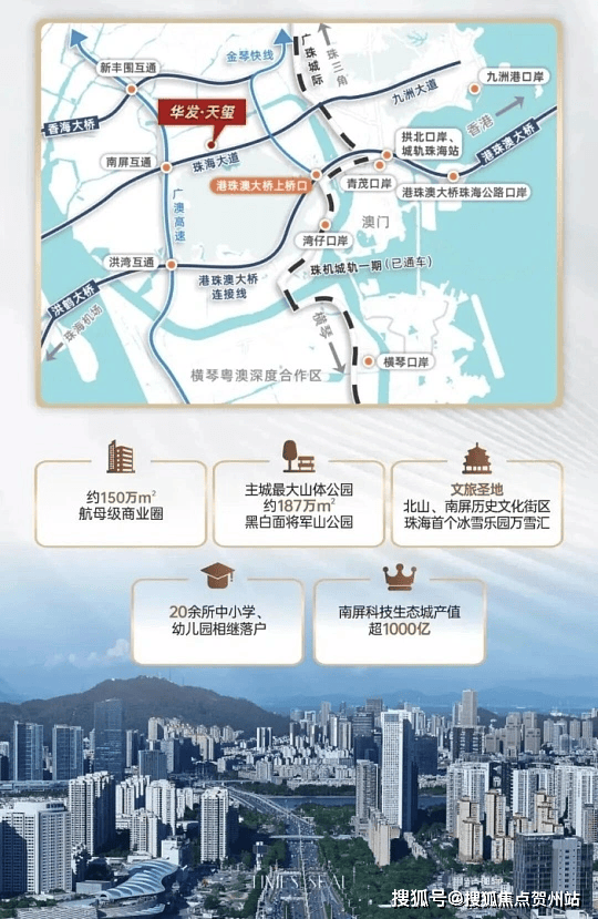 交通配套:位于南湾核心枢纽,金琴快线、南湾大道串联高新区、十字门与横琴。周边有珠海大桥、洪鹤大桥等多条跨海通道,广珠西线高速南屏出口 1 小时可达大湾区核心城市,周边还规划有珠机城轨、广珠城轨。