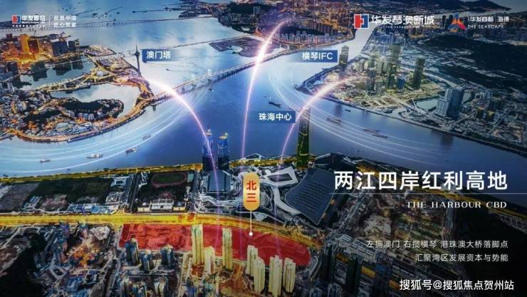 华发琴澳新城位于十字门商务区北片区,与澳门主城、横琴金融岛隔水相望,十字门水道与澳门濠江的温柔环绕,衬托起两地四岸的光芒万丈。