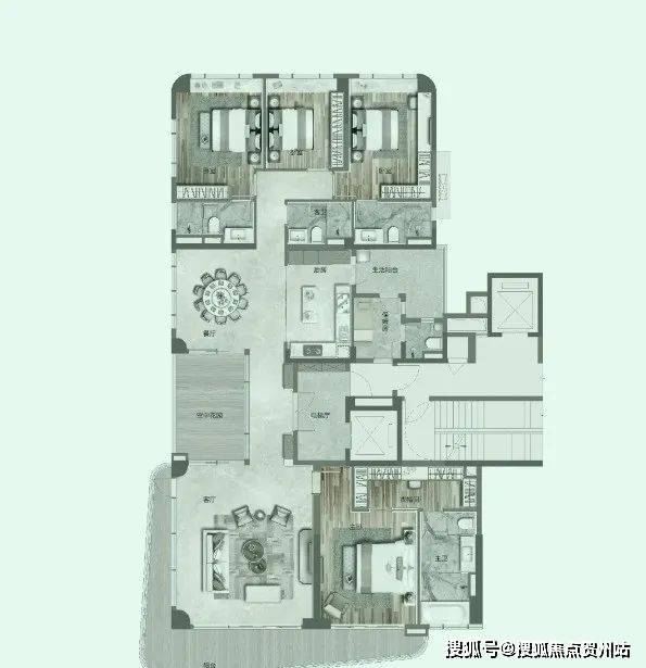 全进口雪花白石材巨幅背景墙,黑胡桃木等名贵木材,造价百万厨房,白宫级空气净化系统RGF、全屋智能马桶等等,每一项都是对标国际顶流精心挑选。