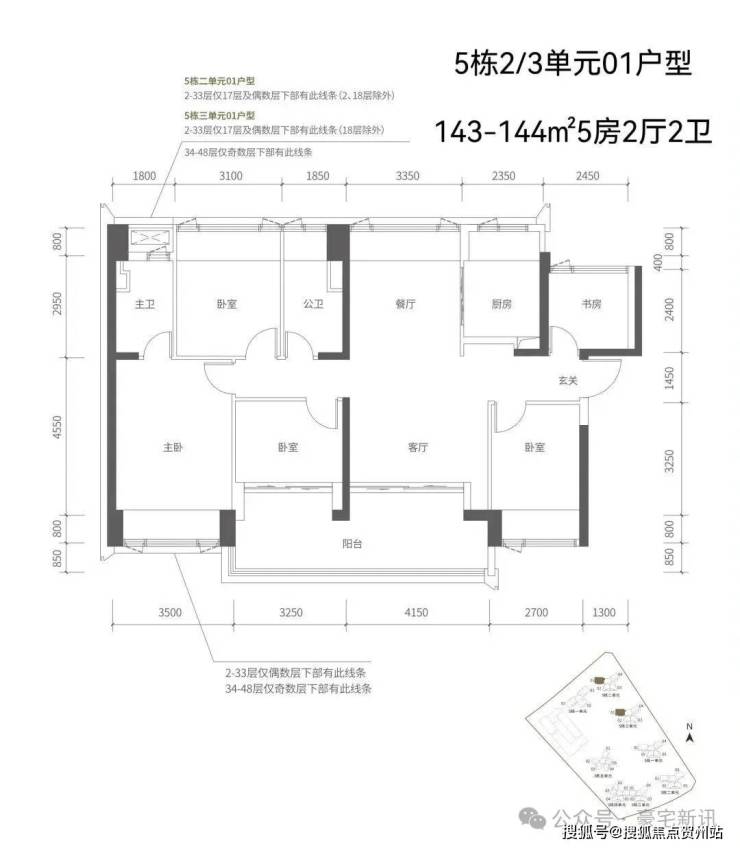 【五栋一单元-平面图】3梯3户,3条腿,分别是01、03号房户型约173㎡的5房2厅2卫、02号房户型约149㎡的5房2厅2卫