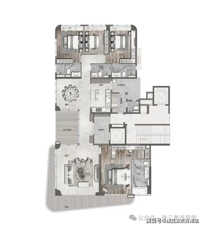 大平层采用的是单梯入户,户型的使用率非常高,我们首先来看看350㎡的大平层(5室2厅5卫),高层是带德系精装修交付的。