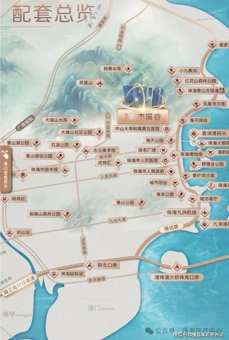 周边配套:约 800 米近情侣路,3 公里内有扬名广场、华润万家、香洲百货等商业体;医疗有中大五院,临近野狸岛公园、城市阳台、珠海大剧院等,生活娱乐配套成熟。