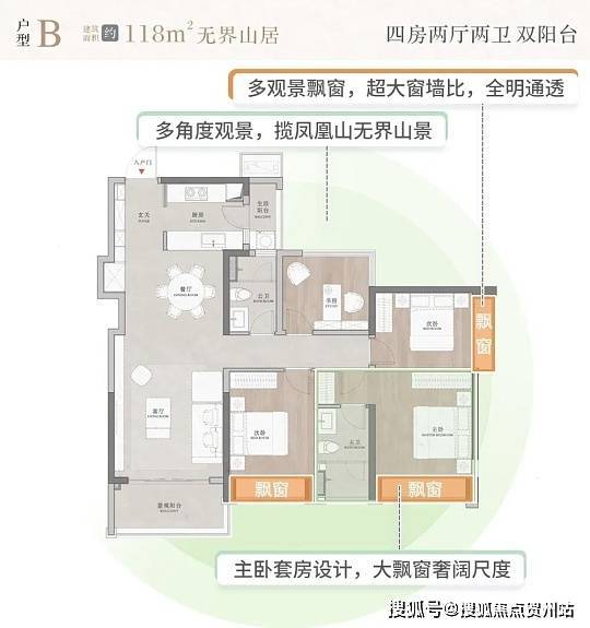 户型与得房率:主力户型 98-165㎡三至四房,均精装交付。98㎡三房紧凑实用,118㎡四房双阳台通透,139㎡四房阔绰,165㎡四房双主卧;常规得房率 78%-82%,含飘窗、设备平台等赠送实得率约 88%-92%,2 栋部分户型接近 95%,空间利用率高。