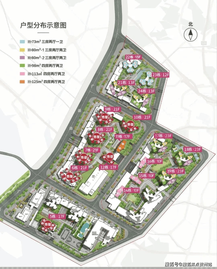 2号地块:6/7/8/9/10栋商品房21F,11/12栋商品房17F,13栋是幼儿园。