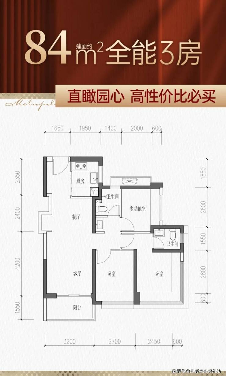84㎡的3房2厅2卫,设计的是经典竖厅格局,客厅3.2米开间,LDKB一体化,S墙设计预留冰箱卡槽位,三开间朝南,3个卧室分别做到了主卧12.37㎡/次卧9.18㎡/次卧6.76㎡(包含墙体飘窗),U型厨房,卫生间三段式分离,得房率约77%(不含赠送),西南或东南朝向。