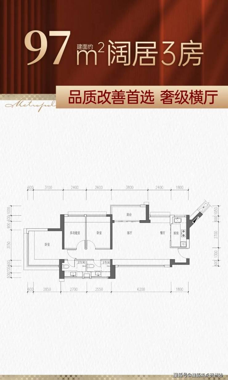 97㎡的3房2厅2卫,设计的是横厅南北通透格局,客餐厅6.2米开间,LDKB一体化,四开间朝南,3个卧室分别做到了主卧13.87㎡/次卧8.58㎡/次卧7.92㎡(包含墙体飘窗),L型厨房,卫生间干湿分离,得房率约77%(不含赠送),阳台主朝东北向。