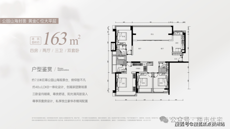 ③163㎡户型处于正品字型黄金单边位独享无遮挡的一线巨幕无界山海公园景观。