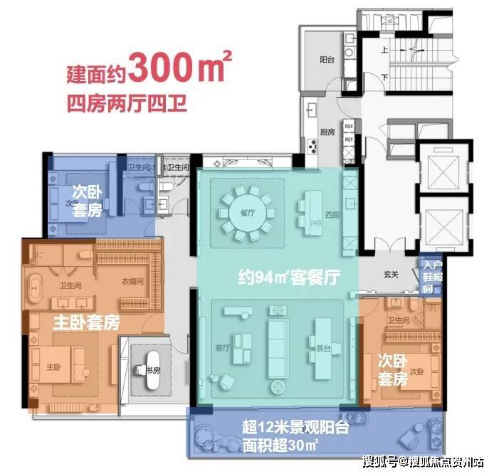 以建面约300㎡的宽幕大平层为例,景观视野全小区最佳,是高端圈层的首选户型。