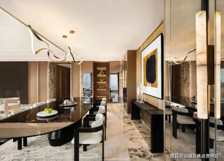 全球多达6种的稀贵奢石装点着室内,大面积、流动纹路的天然石材运用更是给人“一入户就震撼”的视觉冲击。土耳其古堡灰、意大利威尼斯棕、意大利鱼肚金和迪奥金……让室内成为一座奢石博物馆。