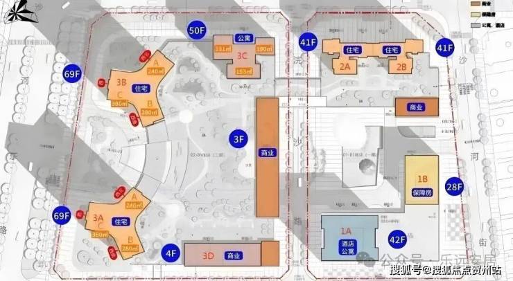 总栋数:8栋(1A栋42层酒店+公寓、1B栋28层保障房,2栋1/2单元41层住宅,3A/3B栋69层住宅;3C栋50层公寓、3D栋4层公寓)