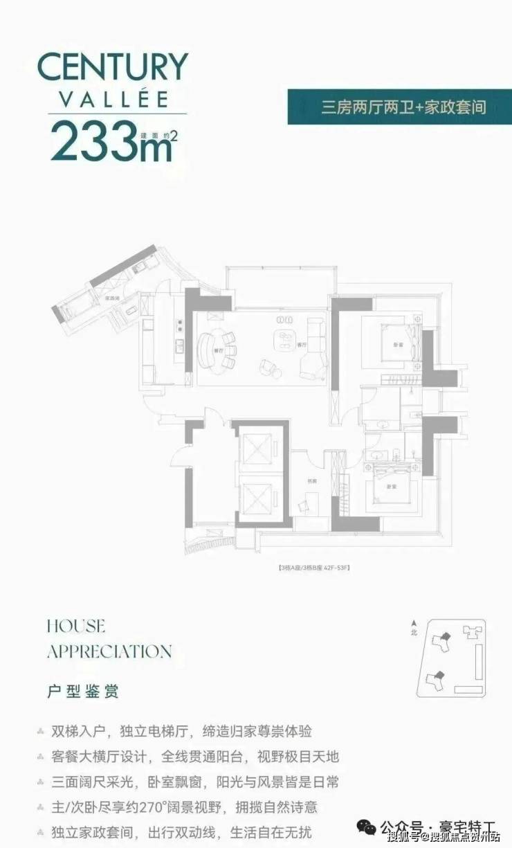 【约233㎡3+1房3卫】双梯入户,独立电梯厅,餐客大横厅贯通阳台,三面采光,主次卧尽享270°环幕视野,还有独立家政套间,西北朝向看名商和沙河高尔夫