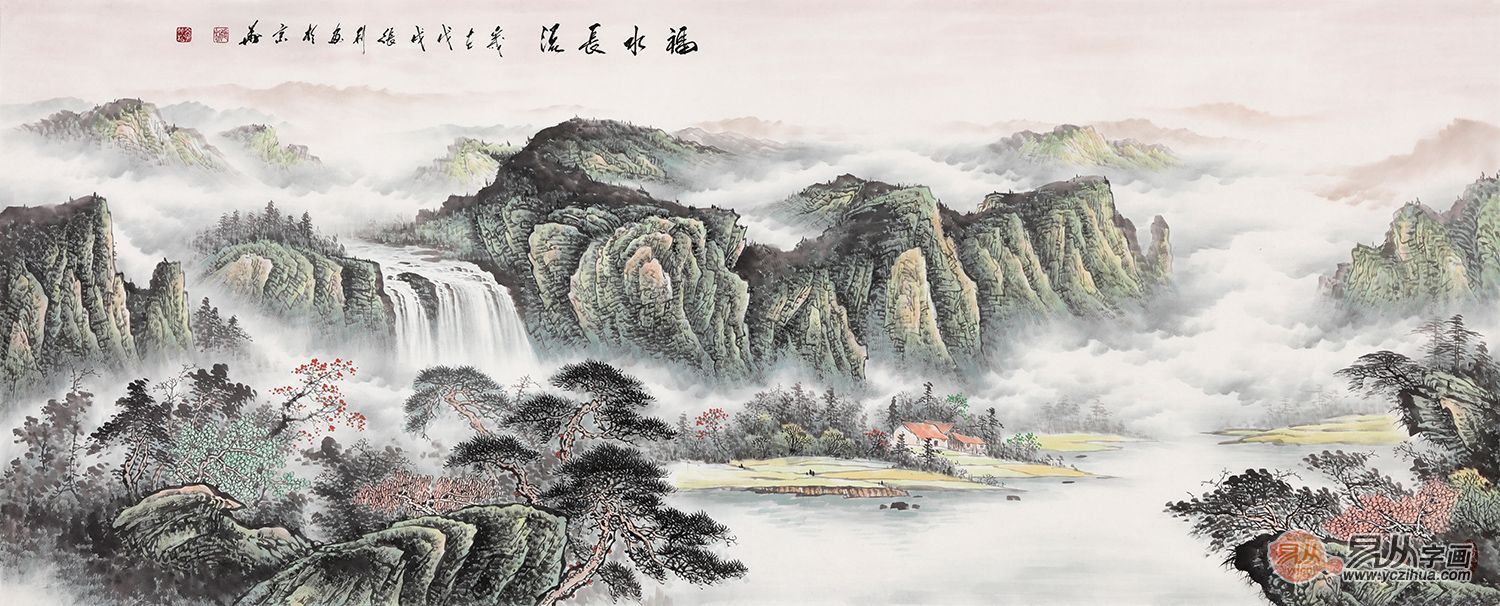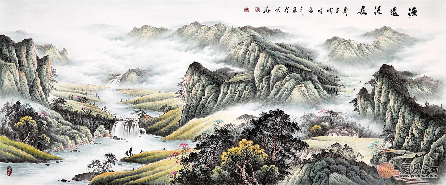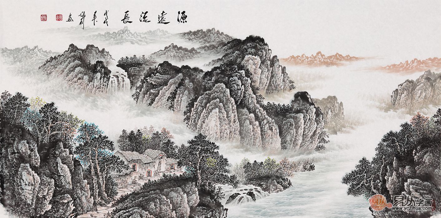 此幅作品笔墨显得坚实浑厚,景物郁茂,气势宏大,远处青山苍翠,云雾缭绕,祥云天降瑞气千条、吉祥伴随。在青山中还有一道瀑布飞流直下,山脚下的几处房屋,一看就知,是个人丁兴旺的村庄,近处还有一条小河流过,水面如镜,整幅画面都显得格外的宁静和谐,体现的是人与自然的和谐。《源远流长》既有很强的艺术表现力和感染力,又巧妙地锲入了“天人合一”地理风水元素,意境悠远,意呈吉祥。作品挂于客厅或办公室,既给您的居室增添艺术品位同时也能改善居室风水。