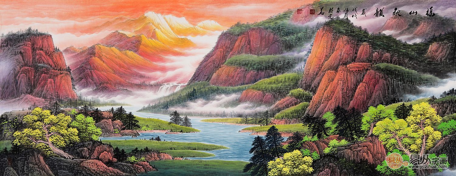 客厅挂画,选择山水画推荐一:张利精品六尺横幅重彩山水画聚宝盆《福山秋韵》