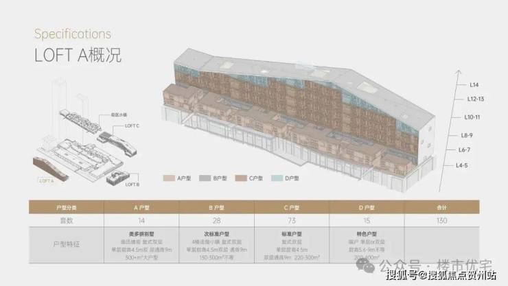 注:LOFT A—130席可出售的LOFT业态;LOFT B—全球首家MUJI酒店和艺术剧场等人文艺术点缀;LOFT C—特色LOFT小镇以及各式特色商铺打造多元商业;LOFT D—中国国际消费电子展示交易平台。LOFT A总建筑面积约3.25万平米,共130套,建筑最高层数为14层,高75米,长220米。