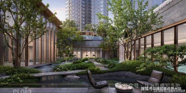 ②仪式感泗水归堂:镜面水庭设计,精选乔木铁冬青(旺宅的寓意)和镜面的水面结合,运用中国东方格局对称美学,借鉴皇家庭院的环抱对称,承载着‘聚水生财’的美好寓意