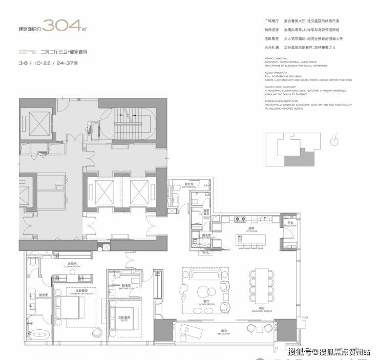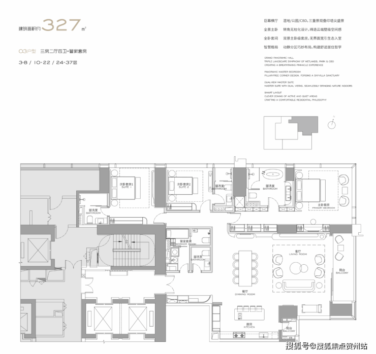 (3-57层)T3栋 四房四卫+家政套间。中西厨分区,餐客西厨一体,带多功能房。端头位置,三面采光。功能完备,房间数充足;实现了主仆双动线;会客观景视野一流。